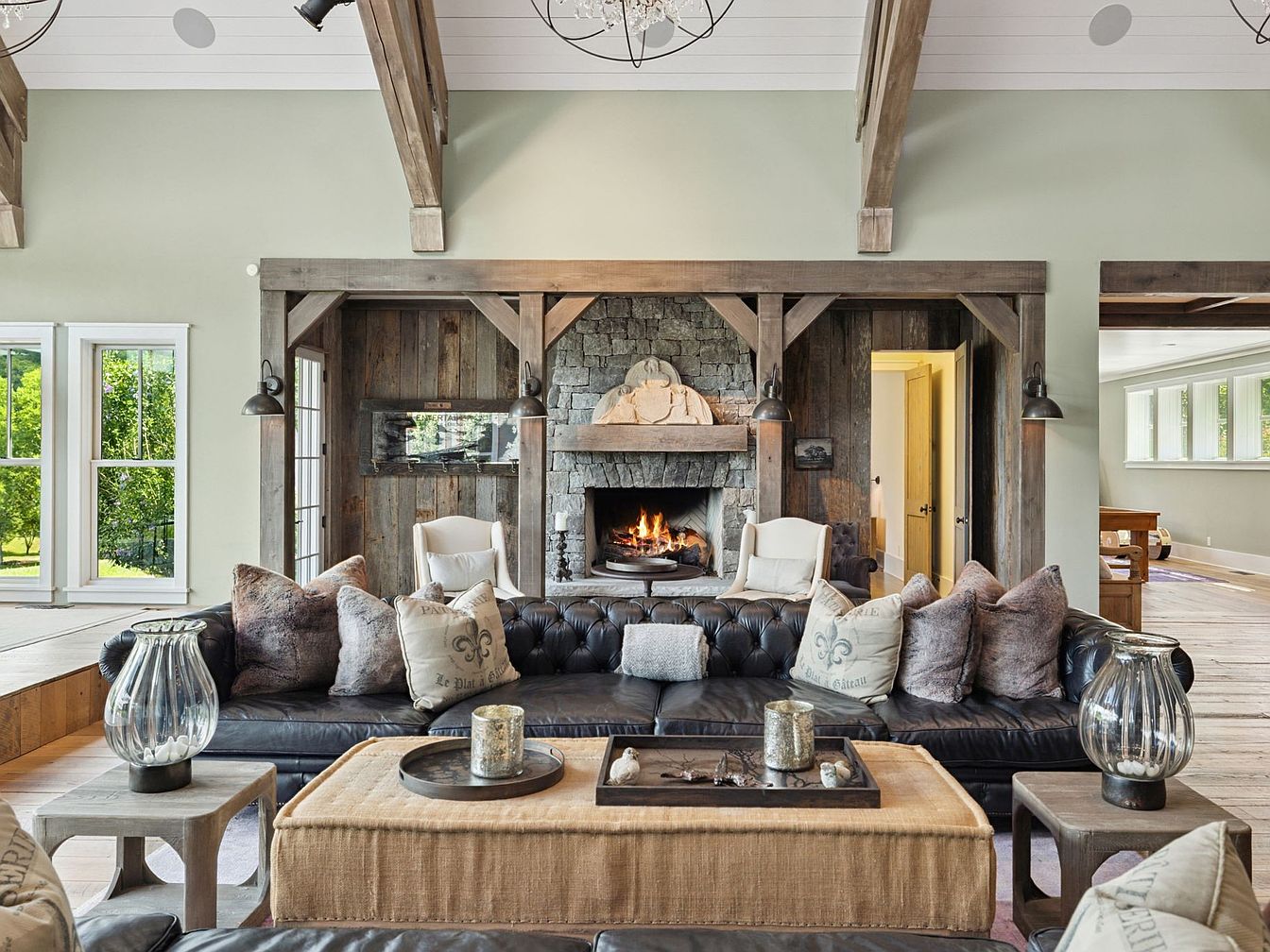 Warm, inviting living room featuring a stone fireplace with a rich wooden mantle, flanked by rustic exposed beams overhead. A plush black tufted leather sofa is covered in a mix of decorative and neutral-hued pillows, offering both comfort and style. Two cream armchairs face the fireplace, creating a conversational layout ideal for family gatherings. Earthy tones and natural materials dominate the color scheme, with soft beige walls, weathered wood paneling, and sleek accent tables. Large windows bathe the space in natural light and provide a view of lush greenery, making this room perfect for relaxation and family activities.