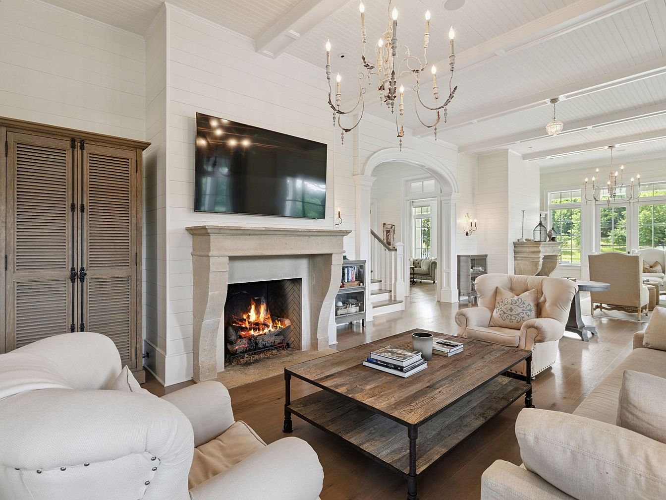 A spacious living room featuring a rustic stone fireplace as the central focal point, topped with a large flat-screen TV. The room is filled with plush, cream-colored armchairs and a matching sofa, perfect for families to gather and relax. The wooden coffee table adds warmth and charm, showcasing a few books and a candle for a cozy touch. Shiplap paneling covers the walls and ceiling, painted in a soft white that brightens the space, complemented by elegant chandeliers above. The room flows openly into a dining area, with large windows bringing in natural light and offering serene views of the greenery outside. The inviting architectural details, including an arched doorway and crown molding, make this a family-friendly and welcoming environment.