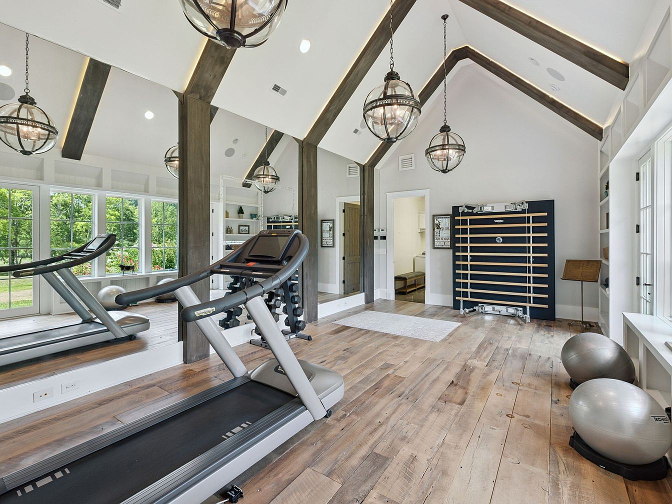 Spacious and bright home gym with vaulted ceilings featuring exposed wooden beams and elegant hanging globe light fixtures. Floor-to-ceiling mirrors line one wall to create an expansive feel and provide excellent visibility during workouts. Large windows let in natural light, offering views of lush greenery outside. The room is equipped with a treadmill, multi-functional strength training equipment, and two silver exercise balls, ideal for family fitness routines. Light, wide-plank wooden floors add warmth and comfort underfoot. Built-in shelves provide convenient storage for wellness gear, while the inviting, open layout makes this a family-friendly area for all ages to stay active together.