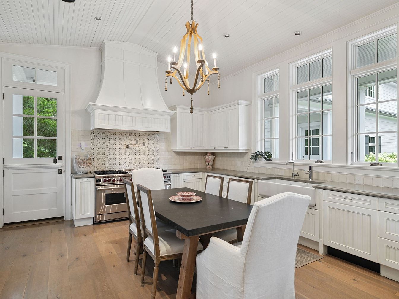 This kitchen features a spacious, open layout designed with families in mind. Large windows bring in abundant natural light, making the room feel airy and welcoming. The white cabinetry, shiplap ceiling, and patterned tile backsplash add a classic, timeless appeal, while the light wood flooring infuses warmth. A central rectangular dining table with upholstered chairs offers a comfortable spot for family meals or homework time. The farmhouse sink, modern stove, and generous counter space create a functional cooking environment. The elegant chandelier serves as a beautiful focal point, contributing to the kitchen’s cozy yet refined atmosphere, perfect for daily gatherings.