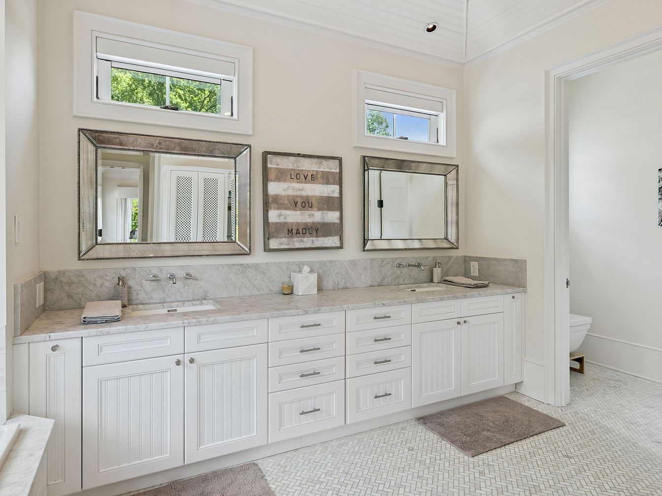 Spacious and bright, this bathroom features a double vanity with white cabinetry and elegant marble countertops, offering ample storage for family needs. Two large, rectangular mirrors are set above each sink, each reflecting light from the pair of transom windows that bring in natural sunlight. The space feels open and inviting due to the high ceilings and crisp white walls, which are complemented by soft gray accents on the floor tiles and bath mats. A sign with a loving message adds a personal touch, while the layout ensures privacy and accessibility, suitable for busy family routines.