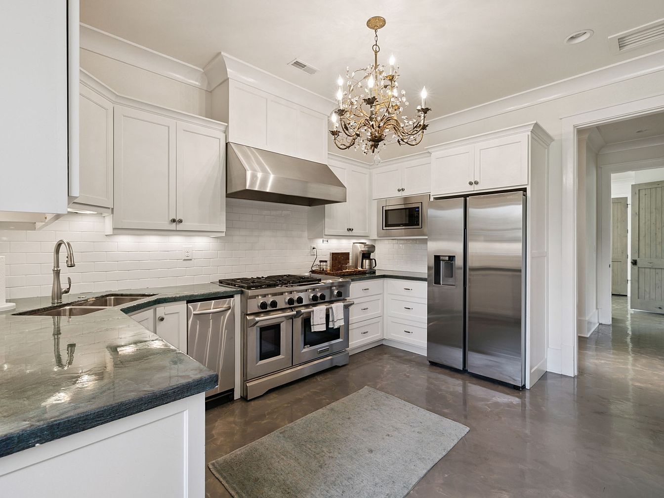 A spacious kitchen features white cabinetry with simple, modern hardware and dark stone countertops. A classic white subway tile backsplash runs along the walls, providing a clean and timeless look. The layout includes a large stainless steel range with a vent hood, double oven, and a roomy double-door refrigerator, making meal prep for families convenient. A deep corner sink sits beneath a wide counter, adding to the functionality. An elegant, ornate chandelier hangs from the ceiling, adding a touch of luxury. The floor is a smooth, shiny concrete, easy to clean and ideal for busy families, while a soft area rug in front of the stove offers added comfort for cooking.