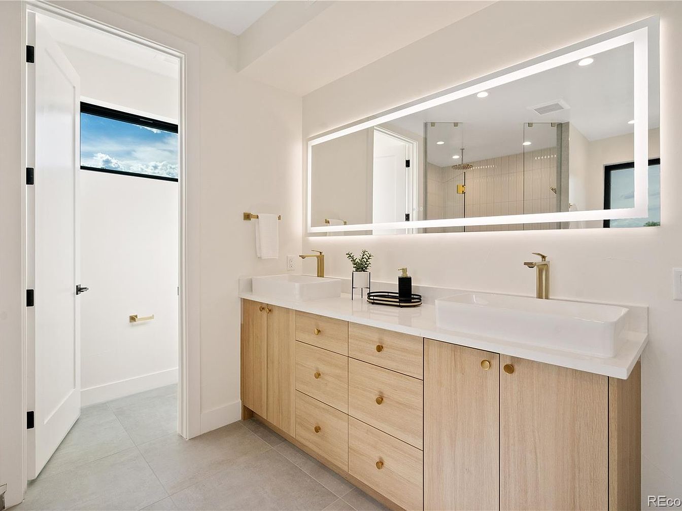 This bathroom features a spacious dual-sink vanity with a sleek, contemporary design. The cabinetry showcases light natural wood tones complemented by round brass knobs that add warmth and elegance. Countertops are pristine white with rectangular vessel sinks paired with stylish brass faucets, enhancing the modern aesthetic. Above, a large, illuminated rectangular mirror provides ample lighting and visual expansiveness to the space. The walls are painted crisp white, contributing to a clean and airy feel. Gray floor tiles add subtle contrast, while a separate toilet area is visible through an open doorway with a small horizontal window letting natural light in.