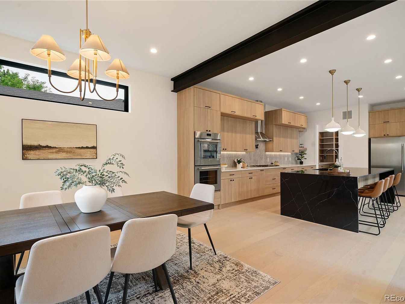 This open-concept space blends a modern kitchen with a cozy dining area. The kitchen features light wood cabinetry complemented by sleek black hardware and a striking black marble island with a waterfall edge. Stainless steel appliances, including a double oven and refrigerator, add sophistication, while under-cabinet lighting highlights the neutral backsplash. Adjacent to the kitchen, the dining zone centers on a dark wood table surrounded by cream upholstered chairs resting on a patterned rug, creating a warm contrast to the light wood flooring. Large windows and brass-accented lighting fixtures enhance the airy and inviting ambiance.