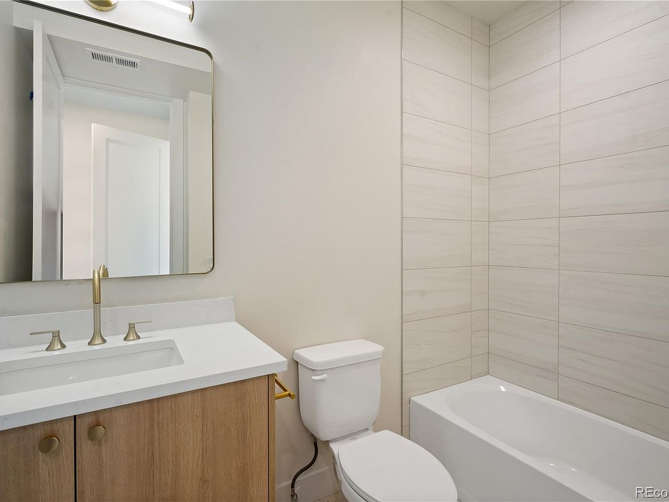 This bathroom features a clean, minimalistic design with a neutral palette dominated by soft beiges and whites. A white countertop with an undermount sink sits atop a light wood vanity cabinet, which adds a touch of warmth to the space. The faucet and hardware are finished in a brushed brass or gold tone, lending subtle elegance. Adjacent is a classic white toilet, and the tub area is lined with large rectangular beige tiles that have faint gray veining, creating a modern yet timeless look. A large mirror with rounded edges sits above the vanity, complemented by a sleek wall sconce, enhancing the room’s bright and airy feel.