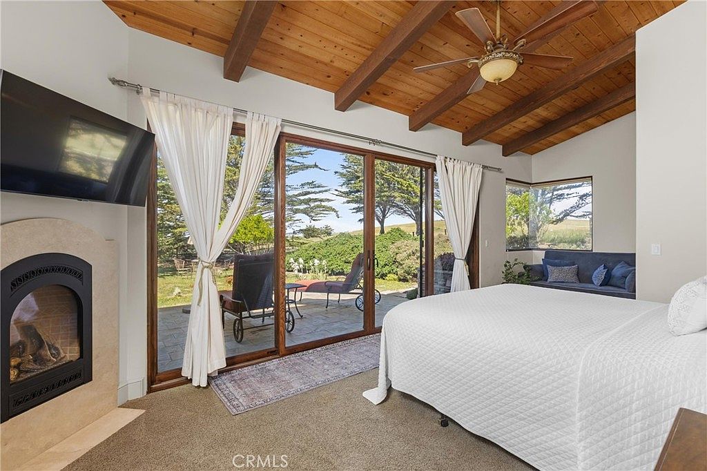 This inviting bedroom features a serene color palette of whites and soft neutrals, creating a calm and airy atmosphere. A white quilted bed dominates the space, complemented by a plush carpet floor and a built-in cushioned nook adorned with blue and patterned pillows in the corner, perfect for relaxing. The wood-paneled ceiling with exposed beams adds warmth and rustic charm while a ceiling fan with a classic design ensures comfort. Glass sliding doors framed in rich wood open out to a stone patio and lush garden area, inviting natural light and scenic outdoor views. A corner fireplace with gently rounded edges and a mounted flat-screen TV add cozy, modern elements to the room.