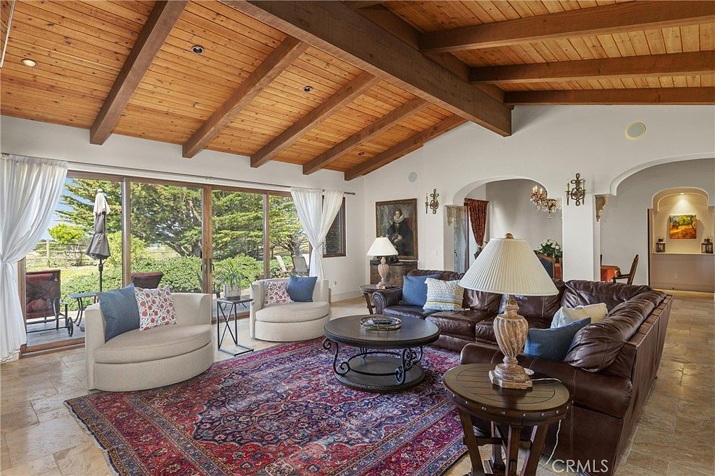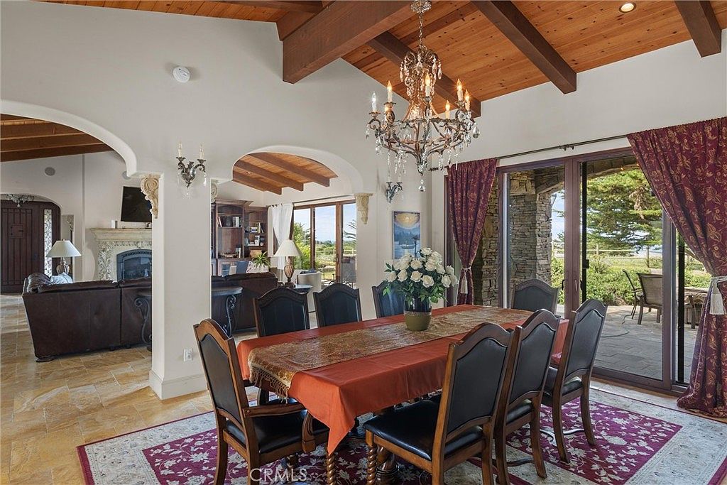 This exceptional home is a Tuscan-inspired villa located in San Simeon, California, nestled on a vast 6.5-acre plot surrounded by the Hearst Ranch. The single-level residence boasts unobstructed ocean and coastal landscape views, with proximity to iconic local landmarks such as the Piedras Blancas lighthouse and the elephant seal rookery, positioned just 15 miles from Cambria along the beautiful coastline. The architectural style reflects classic Tuscan elements including terracotta roof tiles, stone flooring, and a harmonious blend of indoor and outdoor living spaces. The interior highlights include custom chandeliers, multiple fireplaces throughout, and a gourmet kitchen equipped with double ovens, a prep island, and a large butler’s pantry tailored for both culinary enthusiasts and family gatherings. Additional amenities include a three-car garage with an EV charger, with all furniture, furnishings, and appliances included in the sale. The listing price is $2,895,000.