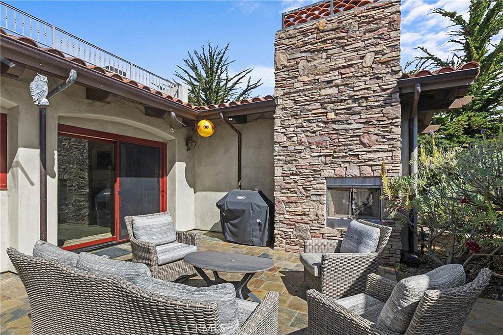 This cozy outdoor patio area features a charming stone fireplace as the focal point, constructed with natural, irregularly shaped stones in warm earth tones. Surrounding the fireplace is a comfortable seating arrangement of woven wicker chairs and a matching loveseat, all with neutral gray cushions that complement the muted browns and tans of the stone and slate floor. The patio is partially enclosed with stucco walls and has a classic terracotta tile roof overhead. Red-framed sliding glass doors offer a smooth indoor-outdoor transition, while a covered barbecue grill adds a functional element for outdoor dining and gatherings. Lush greenery borders the space, adding a touch of nature and privacy.