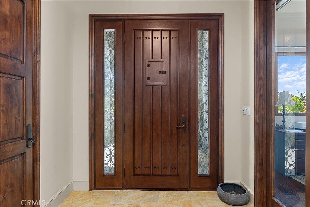 This elegant entrance features a solid wooden door with vertical panels and a charming small hinged opening at the center, adding both style and practicality. Flanking the door are two narrow, textured glass sidelights with intricate wrought iron designs, allowing natural light to filter softly into the foyer while maintaining privacy. The warm wood tones are complemented by the neutral cream-colored walls and the light beige stone tile flooring underfoot. Clean lines and a subdued color palette create a welcoming yet stately first impression, blending rustic craftsmanship with modern simplicity.