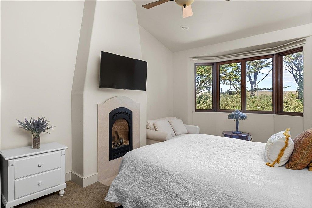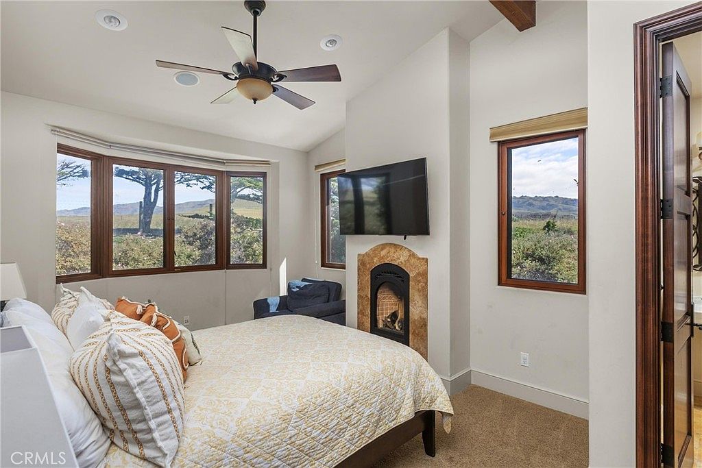 This intimate bedroom exudes comfort with a soft neutral palette dominated by off-white walls and warm beige carpeting. The bed is dressed in a light, patterned quilt with coordinating pillows in cream and soft orange tones, adding subtle warmth and texture. Natural light floods the space through three large, wood-framed windows that offer panoramic views of lush greenery and distant hills. A small, dark blue accent chair is tucked into the corner, enhancing the cozy feel. The focal point is a corner fireplace with a simple stone surround, topped by a flat-screen TV mounted above, creating a perfect blend of modern convenience and rustic charm. Exposed ceiling beams and a ceiling fan contribute to the airy, inviting ambiance of this serene bedroom sanctuary.