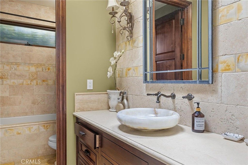 This bathroom features a warm, inviting aesthetic with natural stone tiles in beige and subtle yellow accents covering the walls around the vanity and shower area. The countertop is a smooth, light surface supporting a round, stone vessel sink with a wall-mounted bronze faucet that adds a vintage charm. Below, dark wood cabinetry with clean lines provides storage, enhancing the space’s rustic elegance. A framed mirror with a distressed gray finish hangs above the sink, accompanied by a wrought iron wall sconce with a small fabric shade. Soft olive green paint contrasts gently with the tile, creating a calm, earthy vibe.