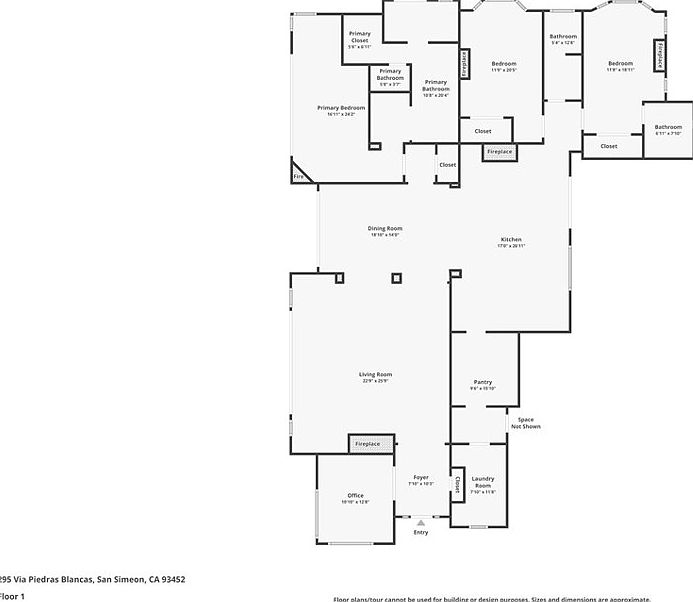 This detailed floor plan outlines a thoughtfully designed home featuring an expansive living room measuring 22’9″ by 25’9″ with a fireplace as a focal point, adjacent to the dining room and kitchen area, providing a seamless flow for entertaining and daily living. The primary bedroom is sizable with an en-suite bathroom and spacious closet, offering privacy and comfort. Additional bedrooms have their own bathrooms and closets for convenience. The layout includes functional spaces like an office, pantry, laundry room, and multiple closets, all efficiently positioned near the foyer and entry for practical access and living.