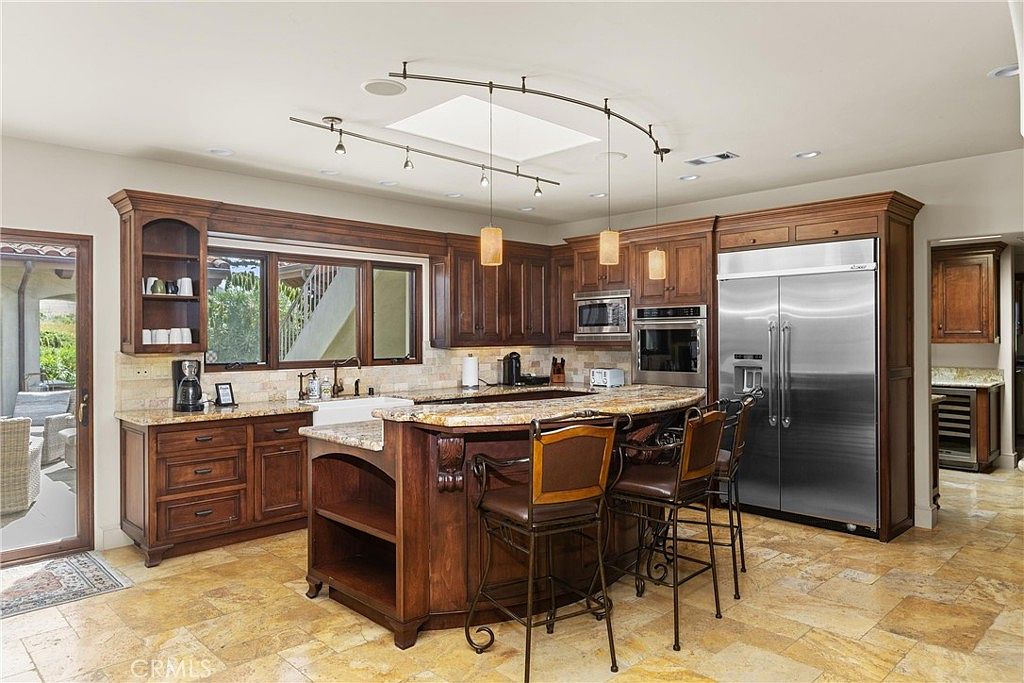 This kitchen features a warm, traditional design highlighted by rich wooden cabinetry that wraps around the space, offering ample storage and a built-in stainless steel refrigerator and double oven. The countertops, topped with polished stone, extend to a spacious island that doubles as a breakfast bar, accommodating four wrought iron stools with leather seats. Overhead, three pendant lights provide focused illumination, complementing the natural light from a large window above the sink and a modern overhead skylight. Neutral-toned floor tiles anchor the room, creating a welcoming and functional culinary area that gracefully blends elegance with comfort.