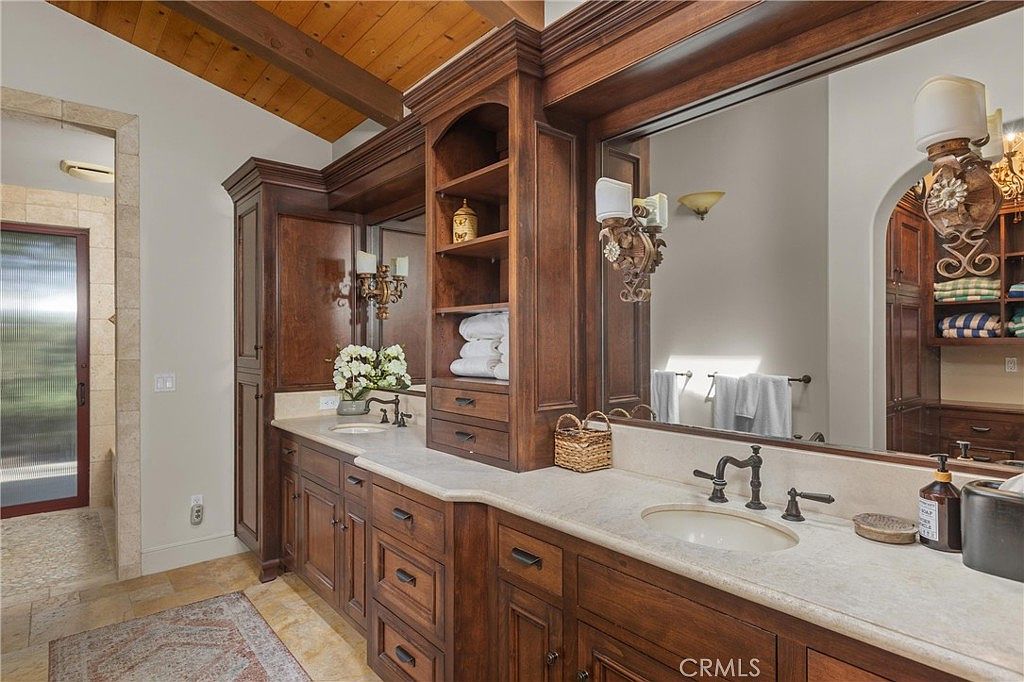 This bathroom features an expansive vanity with rich, dark wood cabinetry that extends from floor to ceiling, creating a warm and luxurious ambiance. The beige marble countertop beautifully contrasts with the cabinetry and includes built-in sinks with traditional bronze faucets. Open shelving and drawers provide functional storage, while decorative sconces with intricate metalwork and candles add elegance. The space is brightened by soft wall colors and natural light filtering through a frosted glass door leading to a tiled shower area. Plush patterned rugs and neatly folded towels enhance the cozy, refined aesthetic.