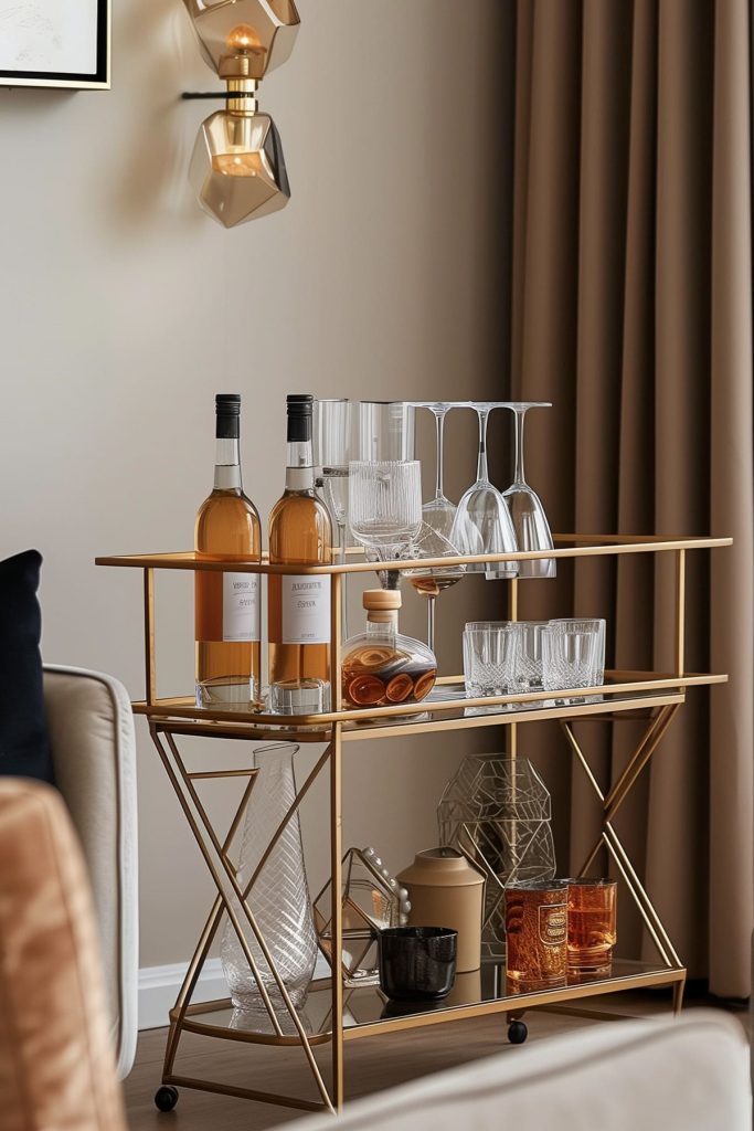 A statement bar cart adds flair and convenience to any gathering, promising both style and practicality.
