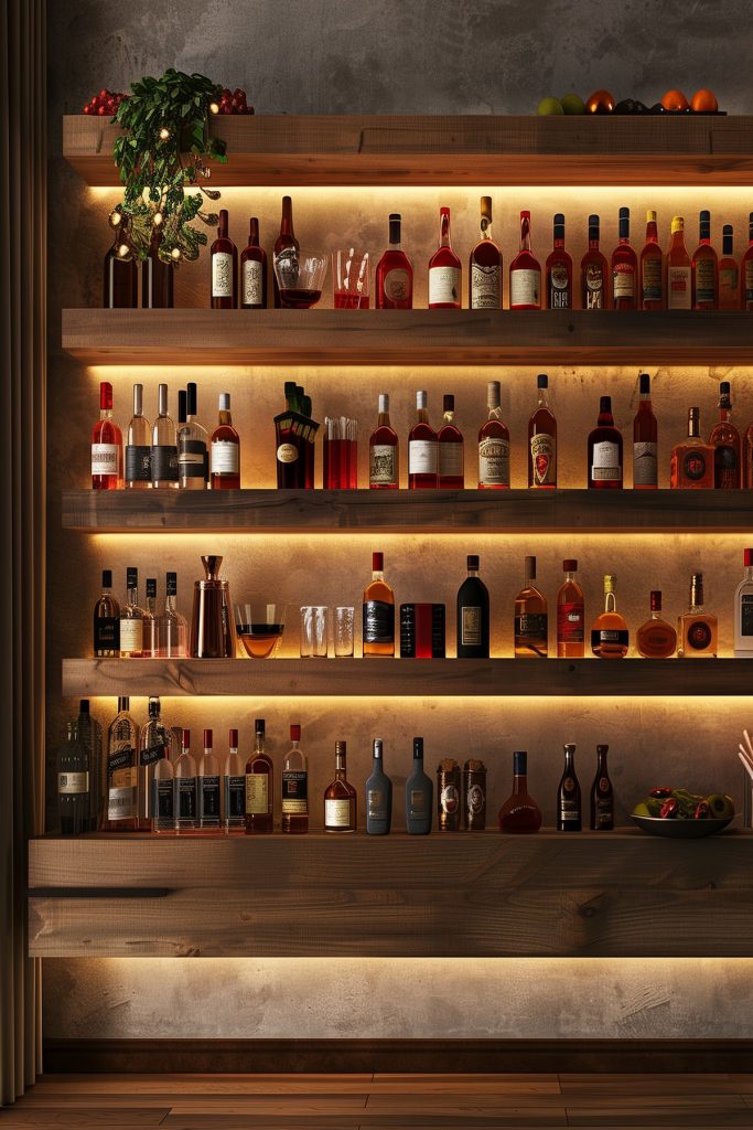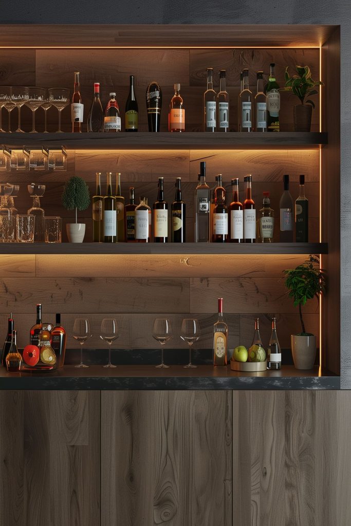 Maximize space and showcase your style with open shelving in your home lounge room bar. Organize your collection of spirits and glassware with ease, adding a touch of sophistication to your setup.
