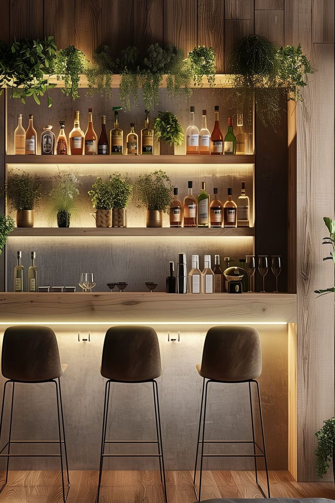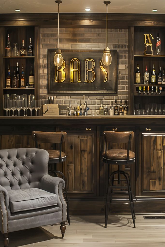 Add a personal touch to your home bar with custom signage featuring your family name, favorite cocktail, or quirky quotes. Hang the signage above the bar or on the wall for a decorative focal point.