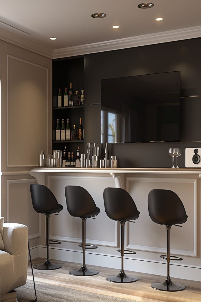 Incorporate entertainment options into your bar area, such as a mounted TV for sports games or a Bluetooth speaker system for playing music playlists. Create a playlist of your favorite tunes to set the mood for gatherings.