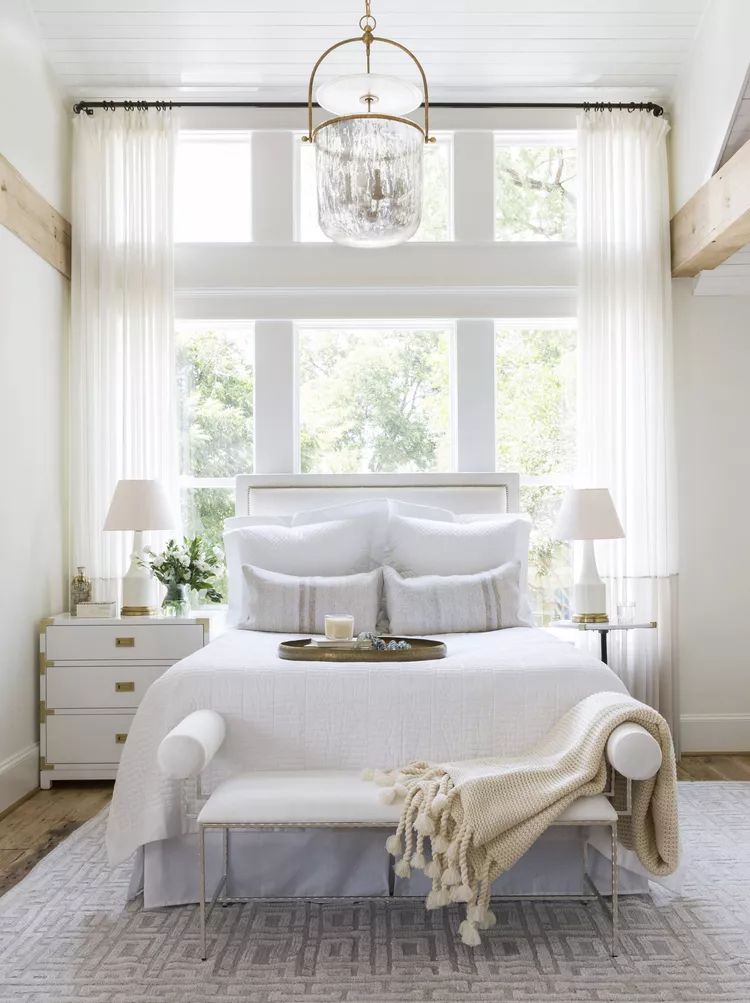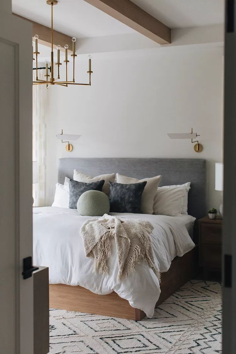 An eye-catching rug anchored beneath the bed can bring pattern and personality into a neutral room without relying on bold color. Whether you prefer a geometric Moroccan print, a classic Persian motif, or a simple textured weave, choose a design that complements your room’s style. The rug can serve as the base for layering neutral linens, pillows, and curtains that echo its pattern or texture.
