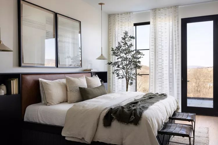 In a modern rustic bedroom, neutral tones enhance the fusion of contemporary lines and natural materials. Consider a feature stone or brick wall behind a platform bed, reclaimed wood beams overhead, and large windows that let in plenty of natural light. By adding layers of wool throws and linen cushions in pale browns and creams, the result is both chic and comforting.