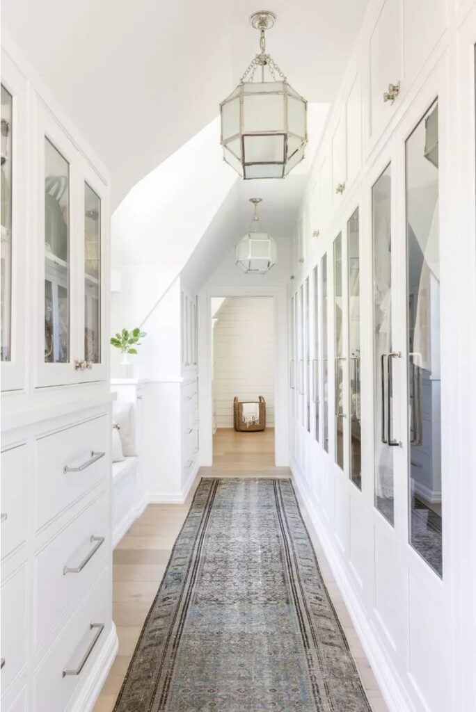 Transform an attic hallway into valuable storage by adding built-in closets. Combine glass-front and solid cabinet doors for an eye-catching design, and incorporate both shelves and drawers to offer versatile storage options. To balance the cabinetry, create a cozy bench nook, complete with colorful pillows, and install an elegant light fixture, like a pendant, to enhance the sense of height and spaciousness in the hallway. This approach not only maximizes storage but also adds a welcoming touch to the space.