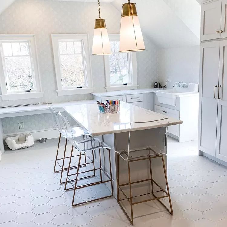 In larger spaces with slanted ceilings, celebrate this architectural feature by applying wallpaper to both the walls and ceiling. This not only creates a unified aesthetic but also draws attention to the slant, making it an intentional part of the design. For storage, opt for full-length cabinets where ceiling height allows, and use lower cabinets where the ceiling dips, ensuring functionality and maintaining a harmonious look throughout the space.