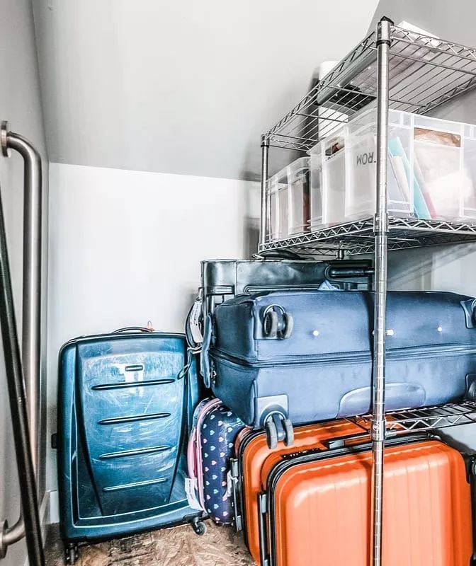 Maximize storage by using a utility shelf unit to organize small suitcases and luggage. Stack suitcases sideways to fit as many as possible while leaving space on upper shelves for bins that can hold smaller travel essentials like neck pillows, luggage tags, and TSA-approved makeup bags. This method keeps everything neatly stored and easily accessible for your next adventure.