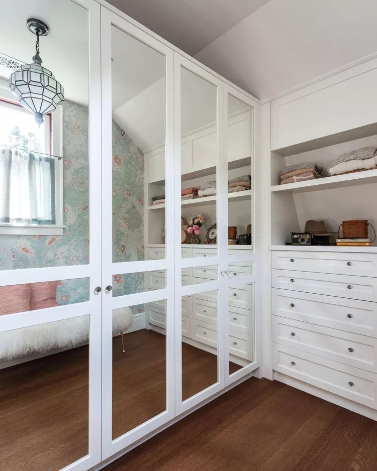 To create the illusion of space in a small attic closet with slanted ceilings, add mirrors. Consider mirrored closet doors or simply hang mirrors on the walls. Not only do they provide a functional way to check your outfits, but they also reflect light, brightening the room and making it feel larger. This simple addition can significantly improve the overall feel of the space without compromising storage or style.