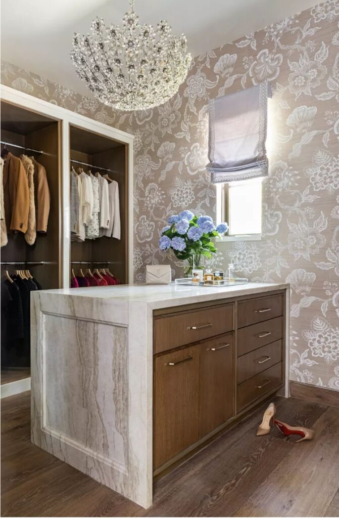 Design a functional walk-in closet by incorporating different types of storage elements. Use floor-to-ceiling shelves for shoes and handbags, hanging rods for clothes, drawers for undergarments, and small compartments for accessories. A surface area for convenience while getting ready is also key. In this setup, the slanted ceiling adds visual interest, enhanced by a statement chandelier, making the space both practical and stylish.
