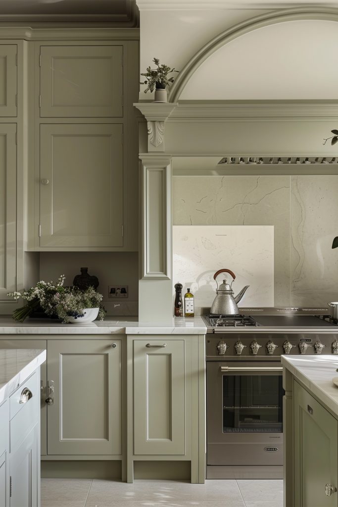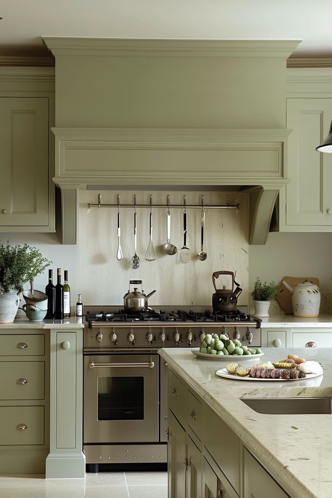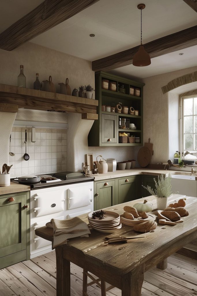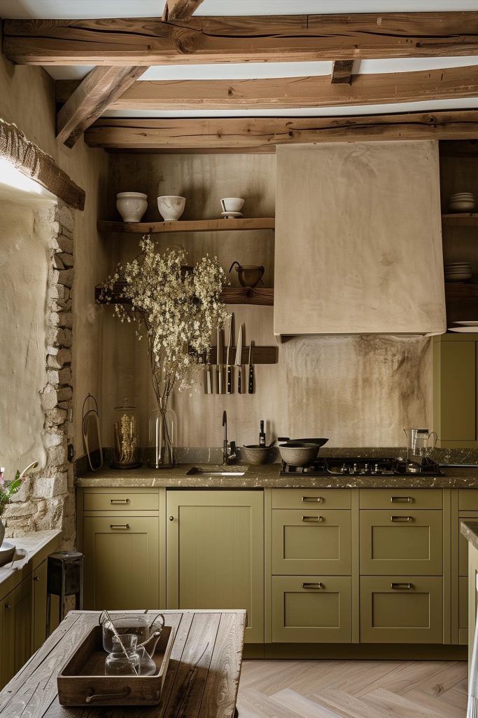 Olive green cabinets envelop rustic and Mediterranean-inspired kitchens with a palpable warmth and depth, evoking the essence of sun-drenched landscapes and ancient terrains.