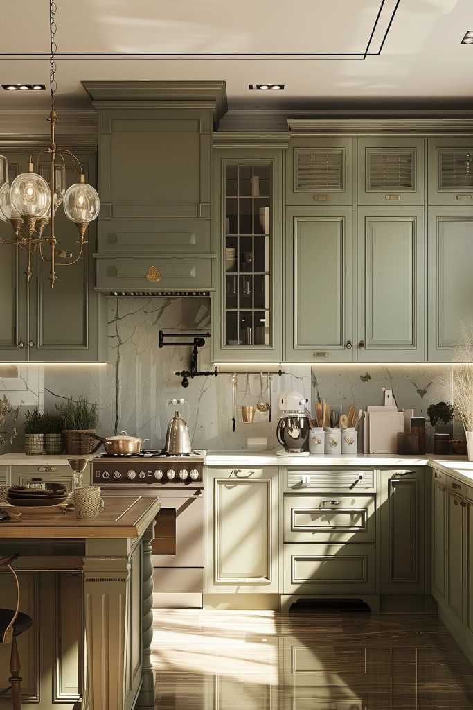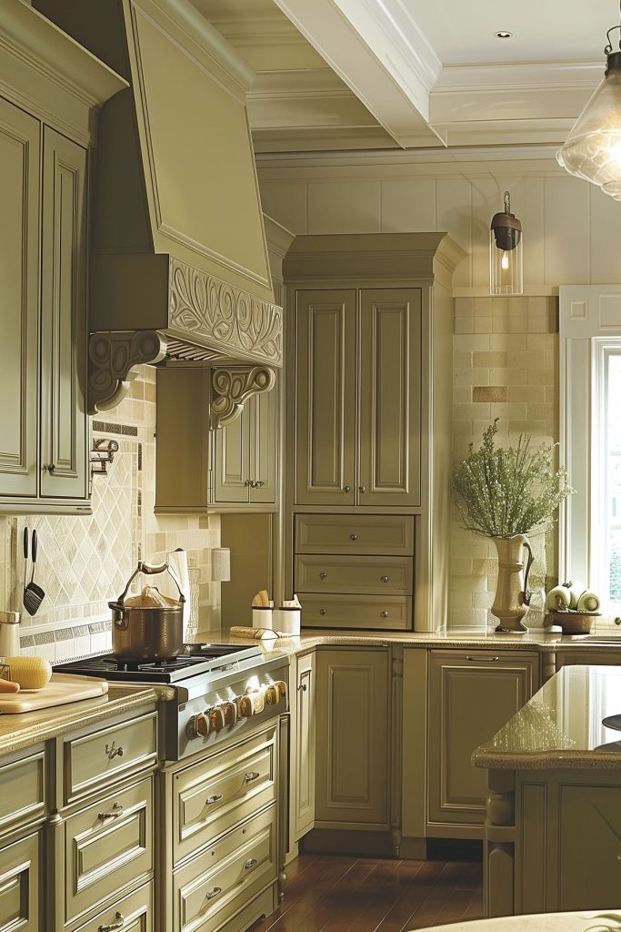 Warm and inviting, olive green cabinets create a cozy and welcoming atmosphere, ideal for traditional and transitional kitchens.