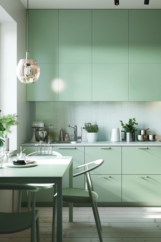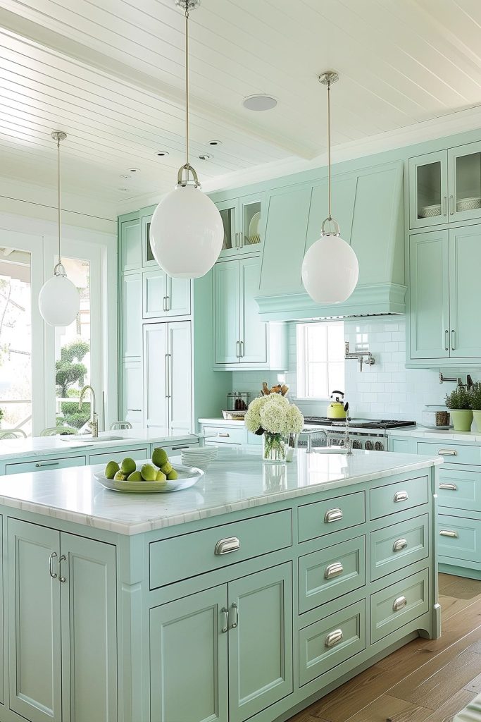 Light and airy, seafoam green cabinets evoke the serenity of coastal living, ideal for beach-inspired kitchens.