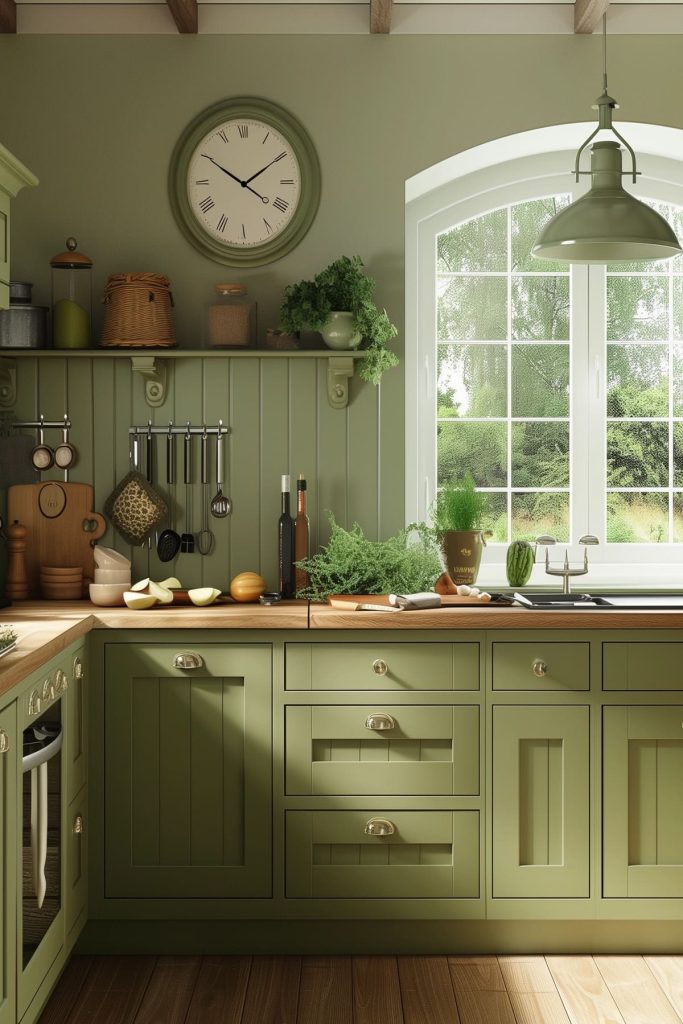 Moss green cabinets, with their earthy tones, effortlessly harmonize with the organic textures and materials found in farmhouse and cottage-style kitchens, creating a cohesive and inviting aesthetic.