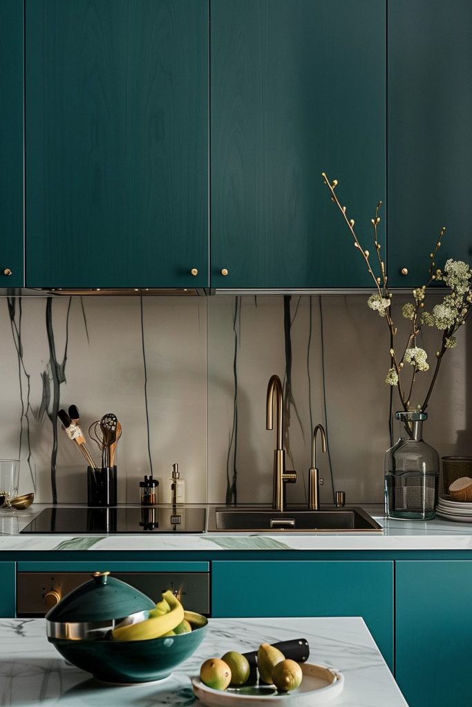 Teal green cabinets, with their bold and striking appearance, command attention and create an immediate focal point in kitchens, adding an element of drama to the space.