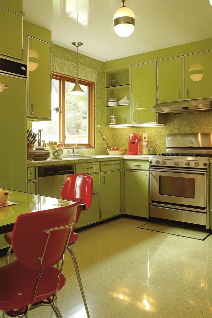 Retro and nostalgic, avocado green cabinets add a vintage touch to mid-century modern and eclectic kitchens.