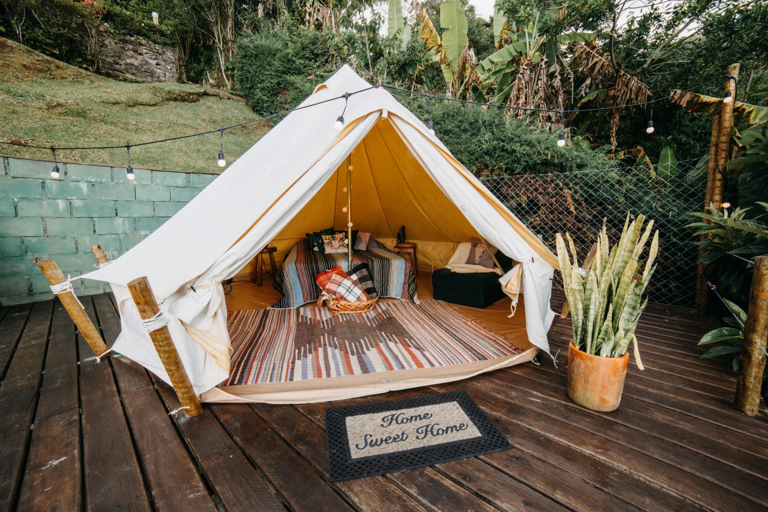 Styling the tent entrance creates an attractive focal point. Placing a lantern, rug, or small plant beside the opening makes it look inviting and warm. Simple touches like neatly rolled flaps or a clean welcome mat help the tent appear organized. This spot often becomes the most photographed part of a campsite, so adding small decorative accents adds charm. When the entrance feels thoughtfully arranged, the entire campsite feels more refined. These small improvements bring a glamping-style atmosphere without requiring costly equipment or elaborate decorations.