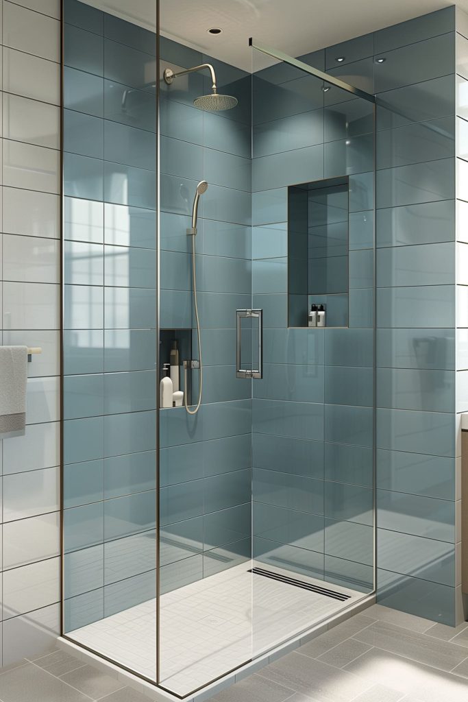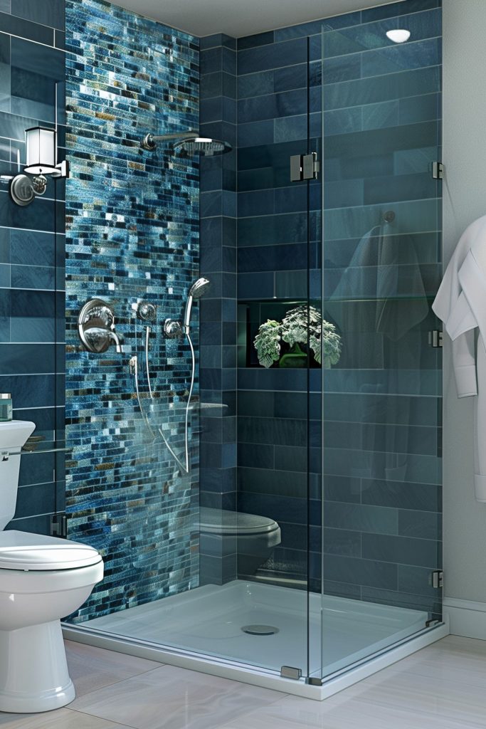 Dive into tranquility and sophistication with the serene allure of blue hues in your shower tile combination, evoking the calming ambiance of ocean waves and clear skies.