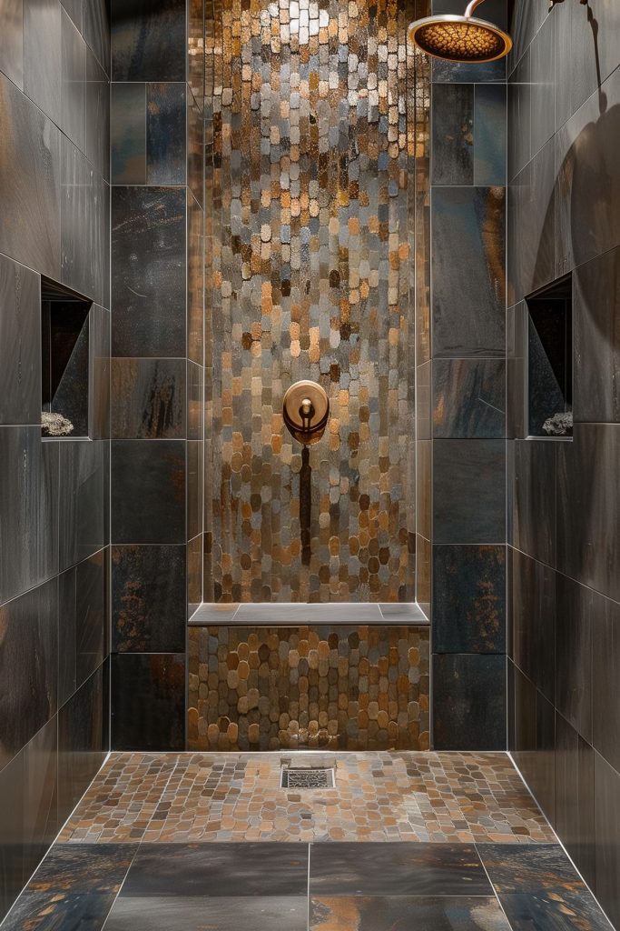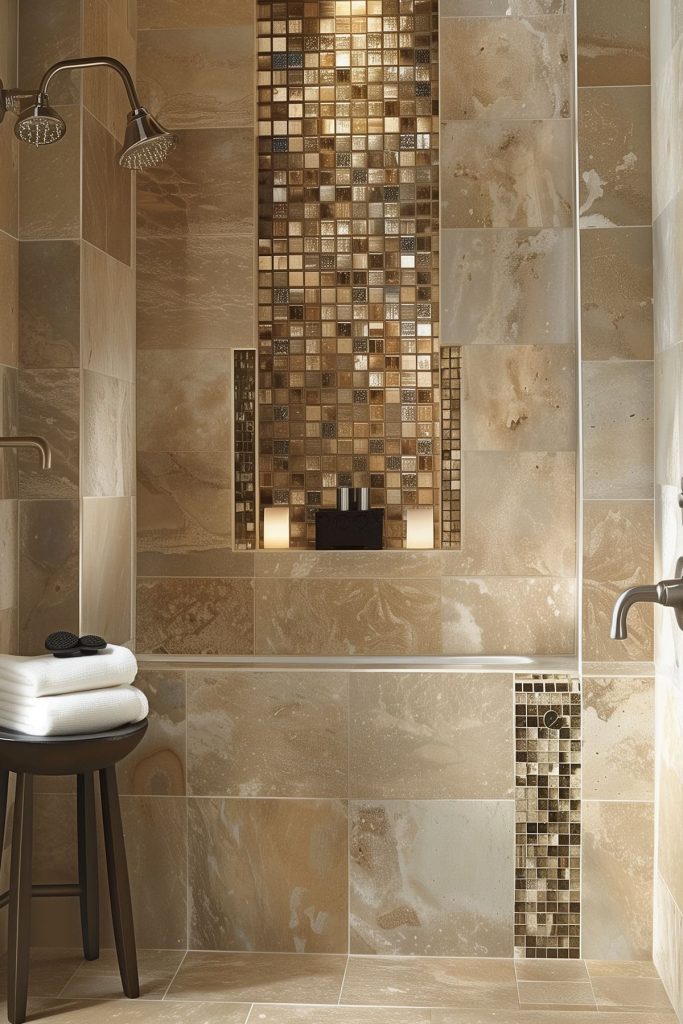 Infuse your shower space with a touch of glamour and sophistication with the shimmering allure of metallic accents in your tile combination.