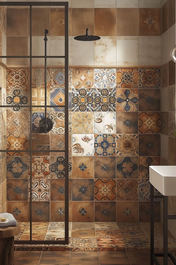 Transport yourself to the sun-drenched landscapes of Spain with the vibrant allure of Spanish-inspired tiles in your shower combination.