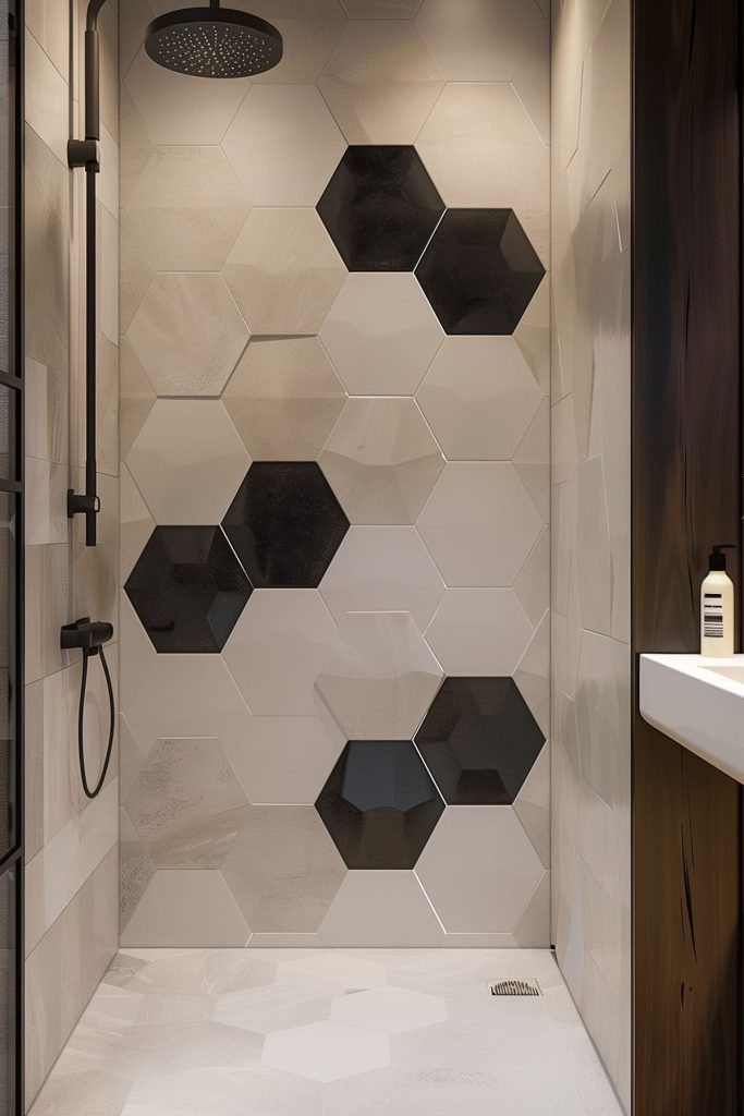 Transform your shower into a captivating retreat with the contemporary allure of hexagonal tiles.