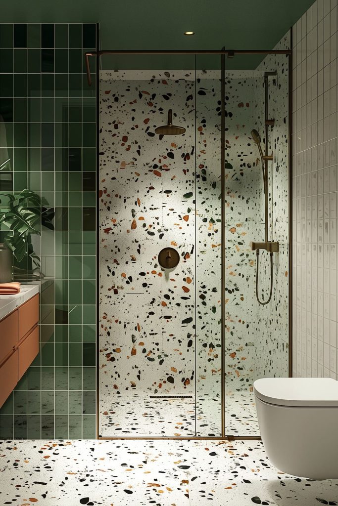Timeless elegance with the fusion of classic subway tiles and the captivating charm of terrazzo in your shower.