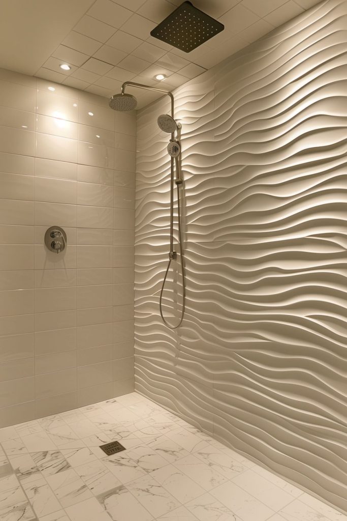 Choose tiles with sculptural elements or relief patterns for a three-dimensional effect that adds visual interest and depth to your shower walls.