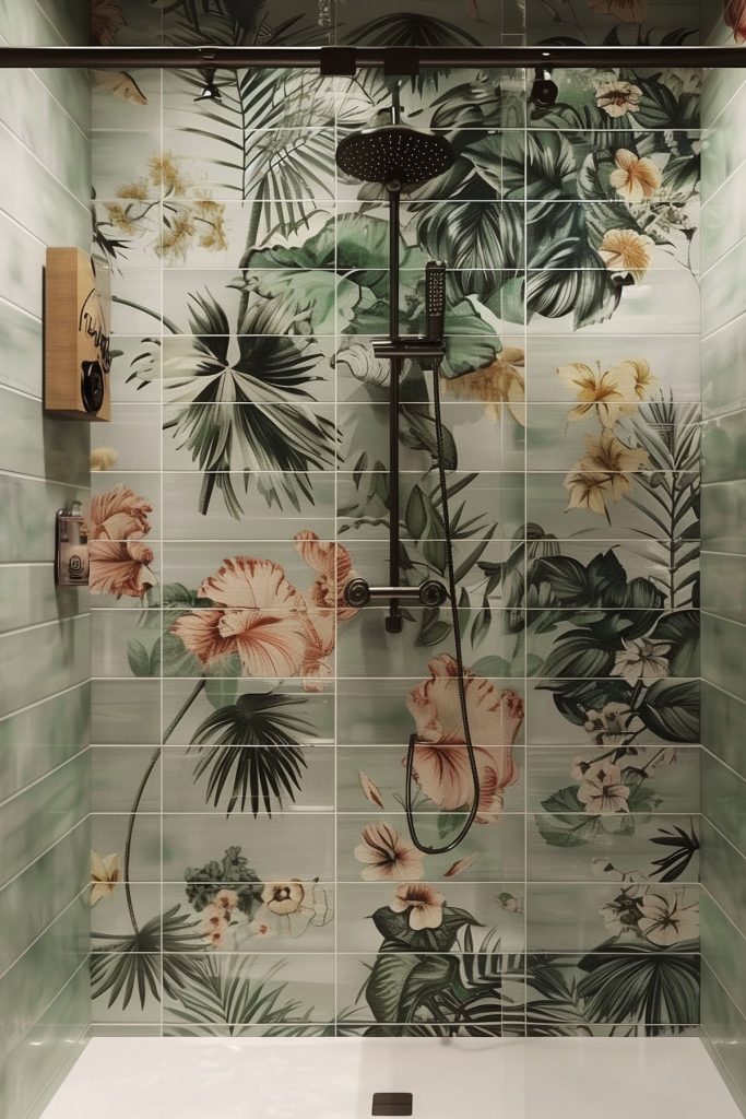 Bring the beauty of nature indoors with floral or leaf-patterned tiles. Whether it’s delicate blossoms or bold foliage, botanical tiles infuse your shower with freshness and vitality.
