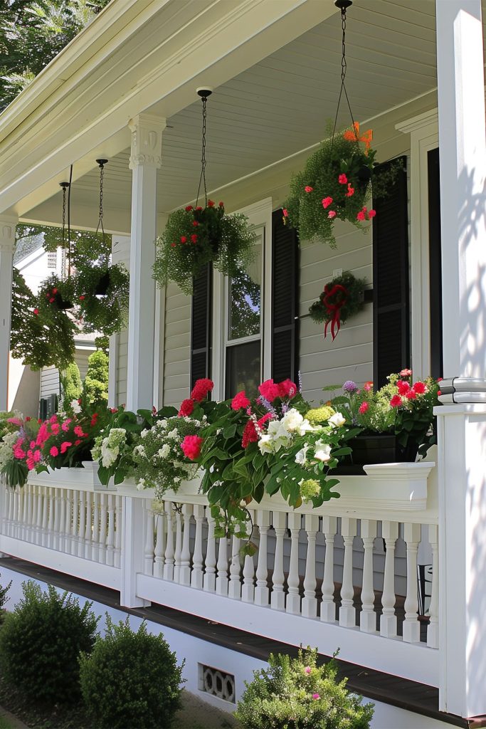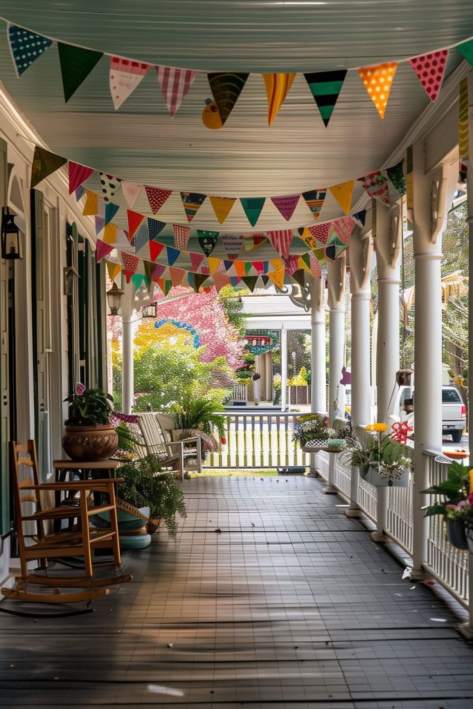 Infuse your long front porch with festive charm using colorful banners, adding a playful touch to your outdoor space. Hang banners along the railing or above the entrance to celebrate special occasions or seasons.
