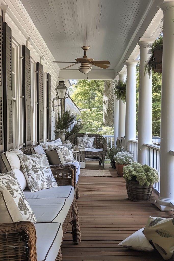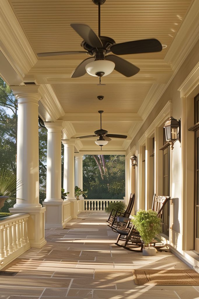 Enhance comfort on your long front porch with ceiling fans, providing a cool breeze on warm days. Choose fans with stylish designs and weather-resistant materials to withstand outdoor conditions.