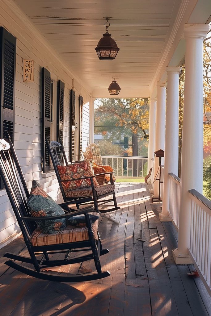 Enhance your long front porch with classic rocking chairs, offering timeless charm and relaxation. Choose coordinating cushions for added comfort and style, creating an inviting space for guests.