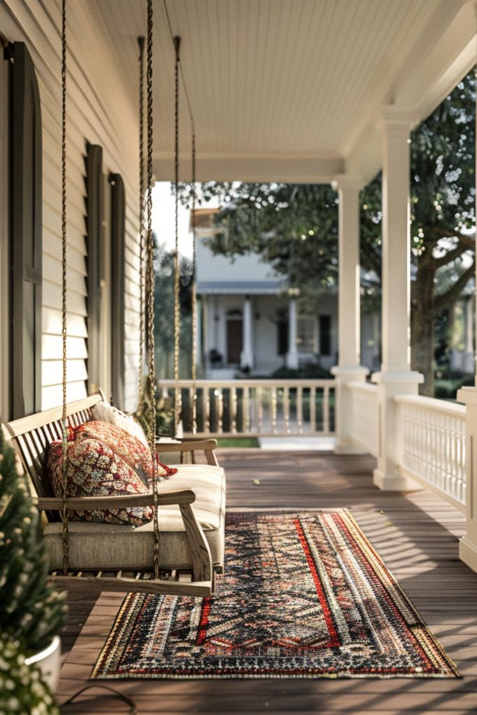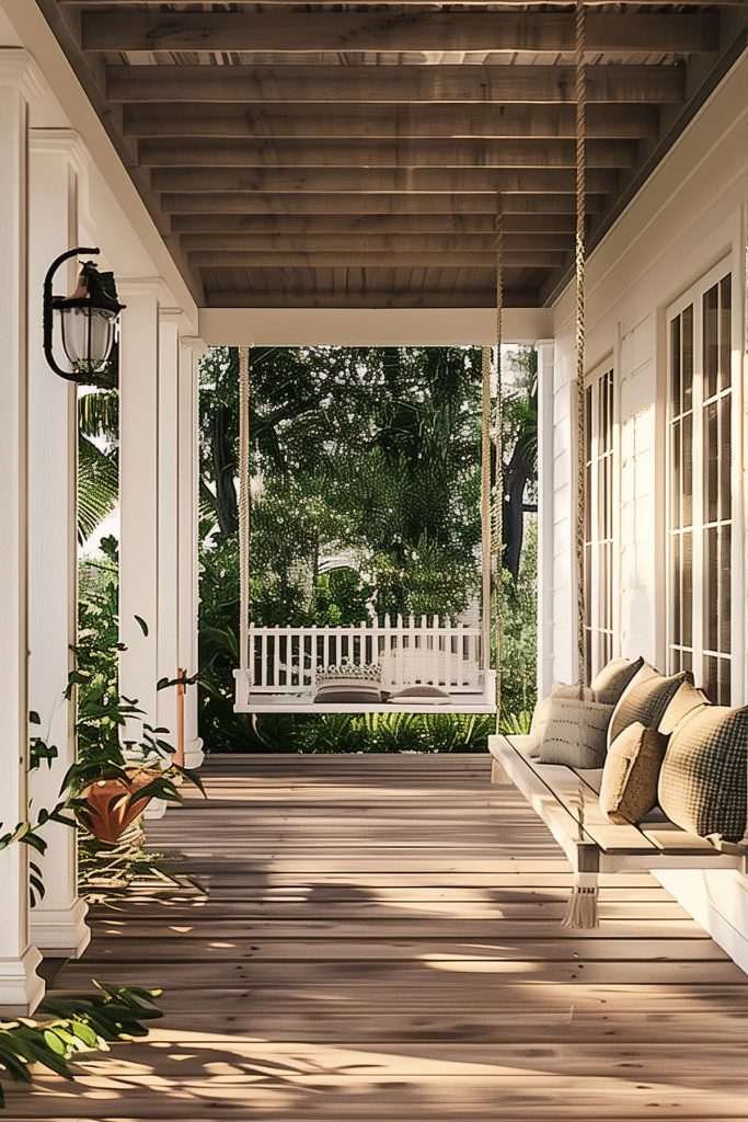 Transform your long front porch into a tranquil retreat with a bench swing, offering a charming spot for relaxation.
