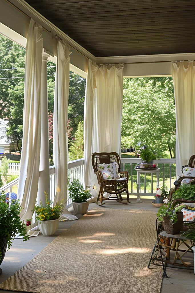 Transform your long front porch into a private retreat with outdoor curtains, offering shade and style. Choose weather-resistant fabrics in colors or patterns that complement your porch decor.