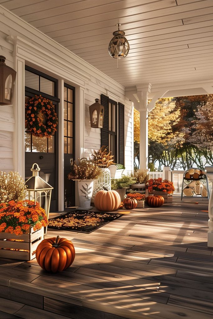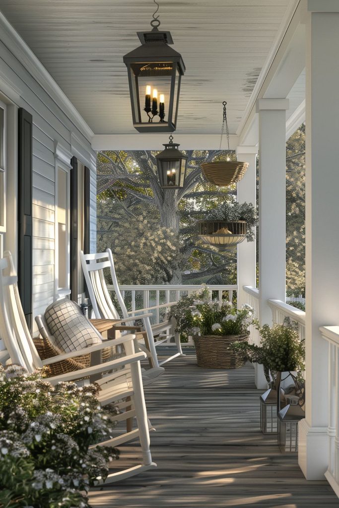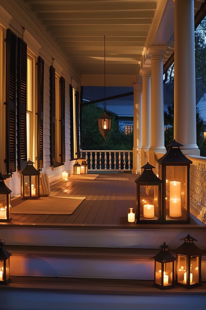 Illuminate your long front porch with outdoor lanterns, casting a warm and inviting glow for cozy evenings.