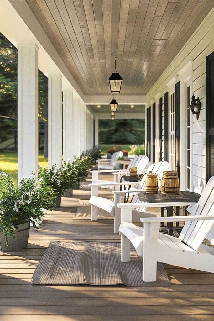 Add a touch of classic charm to your long front porch with Adirondack chairs, providing comfortable seating for relaxation. Choose durable, weather-resistant materials in a range of colors to complement your porch’s aesthetic.